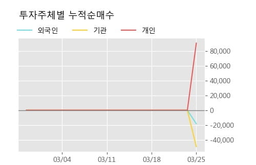 지난 한달을 기준으로 보면 외국인이 1.8만주를 순매도했고, 기관도 4.9만주를 순매도했지만, 개인은 오히려 9.1만주를 순매수했다. 같은 기간 거래비중은 개인투자자가 전체 거래량의 96.0%를 차지했고, 외국인과 기관은 같은 비중인 0.4%를 각각 차지했다.