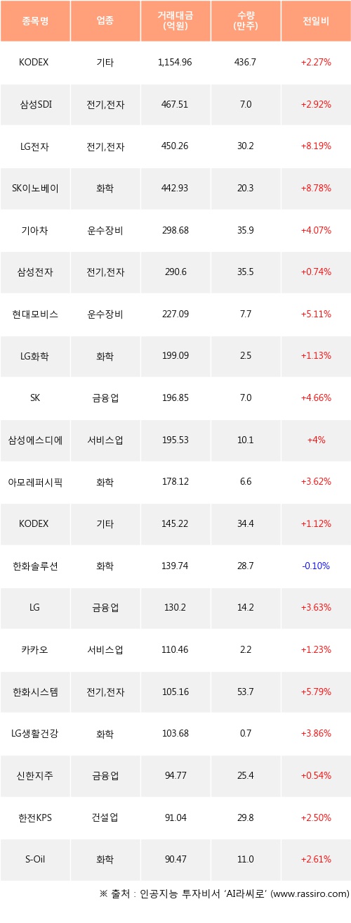 기관 투자자의 순매수 상위 20개 종목은 KODEX 레버리지, 삼성SDI, LG전자, SK이노베이션, 기아차, 삼성전자, 현대모비스, LG화학, SK, 삼성에스디에스등이다.