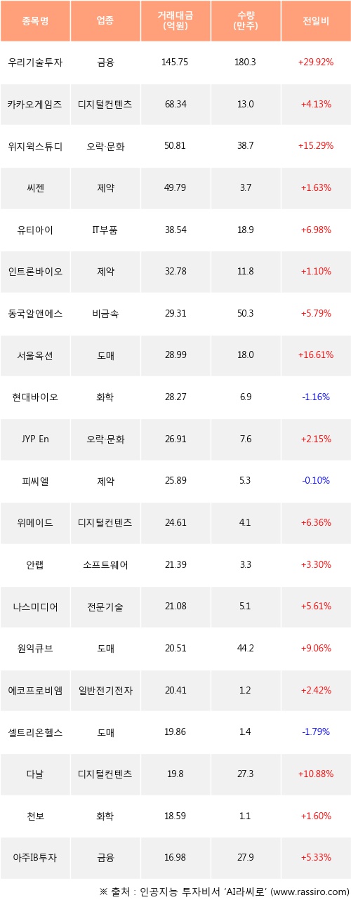 우리기술투자, 카카오게임즈, 위지윅스튜디오 등은 전일 대비 주가가 상승했고, 현대바이오, 피씨엘, 셀트리온헬스케어 등은 주가가 하락했다.