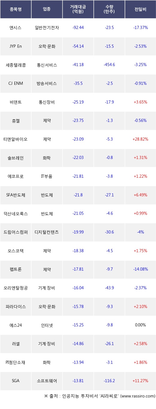 외국인 투자자의 순매도 상위 20개 종목은 엔시스, JYP Ent., 세종텔레콤, CJ ENM, 비덴트, 휴젤, 티앤알바이오팹, 솔브레인, 에코프로, SFA반도체등이다.