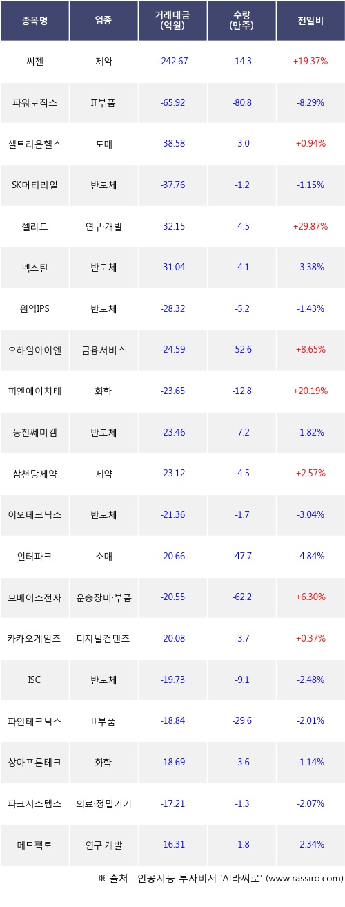 기관 투자자의 순매도 상위 20개 종목은 씨젠, 파워로직스, 셀트리온헬스케어, SK머티리얼즈, 셀리드, 넥스틴, 원익IPS, 오하임아이엔티, 피엔에이치테크, 동진쎄미켐등이다.