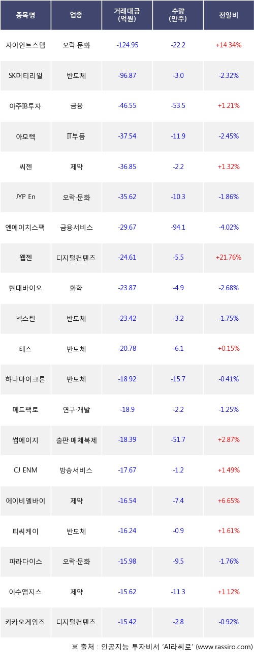 기관 투자자의 순매도 상위 20개 종목은 자이언트스텝, SK머티리얼즈, 아주IB투자, 아모텍, 씨젠, JYP Ent., 엔에이치스팩16호, 웹젠, 현대바이오, 넥스틴등이다.