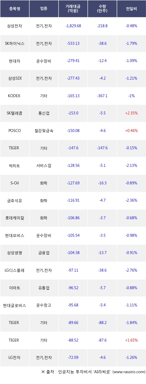 기관 투자자의 순매도 상위 20개 종목은 삼성전자, SK하이닉스, 현대차, 삼성SDI, KODEX 코스닥150선물인버스, SK텔레콤, POSCO, TIGER 미국필라델피아반도체나스닥, 빅히트, S-Oil등이다.