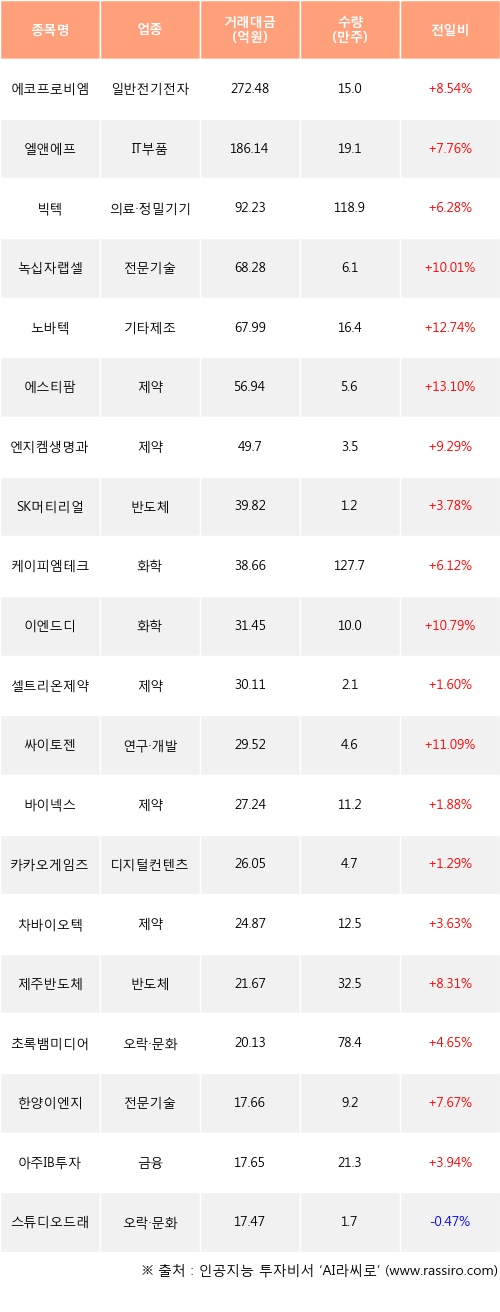 에코프로비엠, 엘앤에프, 빅텍 등은 전일 대비 주가가 상승했고, 스튜디오드래곤 등은 주가가 하락했다.