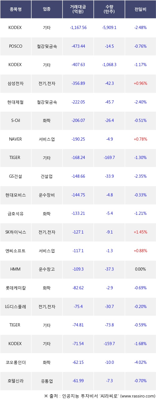 기관 투자자의 순매도 상위 20개 종목은 KODEX 200선물인버스2X, POSCO, KODEX 인버스, 삼성전자, 현대제철, S-Oil, NAVER, TIGER 미국필라델피아반도체나스닥, GS건설, 현대모비스등이다.