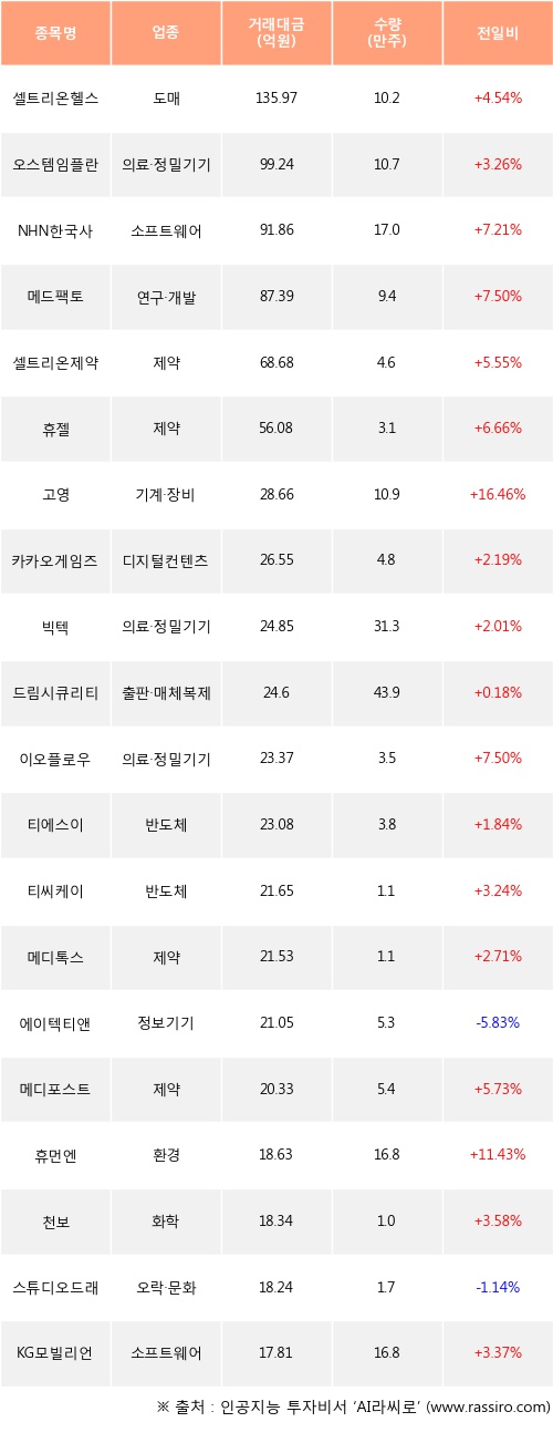 외국인 투자자의 순매수 상위 20개 종목은 셀트리온헬스케어, 오스템임플란트, NHN한국사이버결제, 메드팩토, 셀트리온제약, 휴젤, 고영, 카카오게임즈, 빅텍, 드림시큐리티등이다.