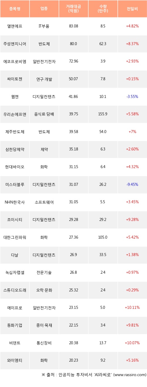 외국인 투자자의 순매수 상위 20개 종목은 엘앤에프, 주성엔지니어링, 에코프로비엠, 싸이토젠, 웹젠, 우리손에프앤지, 제주반도체, 삼천당제약, 현대바이오, 미스터블루등이다.