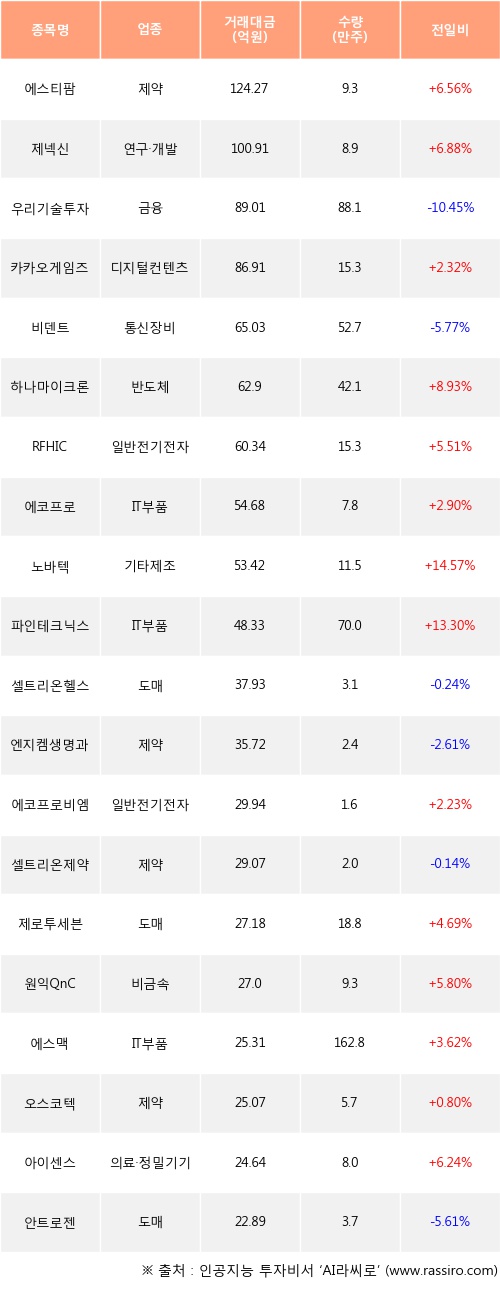에스티팜, 제넥신, 카카오게임즈 등은 전일 대비 주가가 상승했고, 우리기술투자, 비덴트, 셀트리온헬스케어 등은 주가가 하락했다.