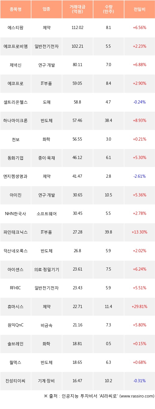 에스티팜, 에코프로비엠, 제넥신 등은 전일 대비 주가가 상승했고, 셀트리온헬스케어, 엔지켐생명과학, 진성티이씨 등은 주가가 하락했다.