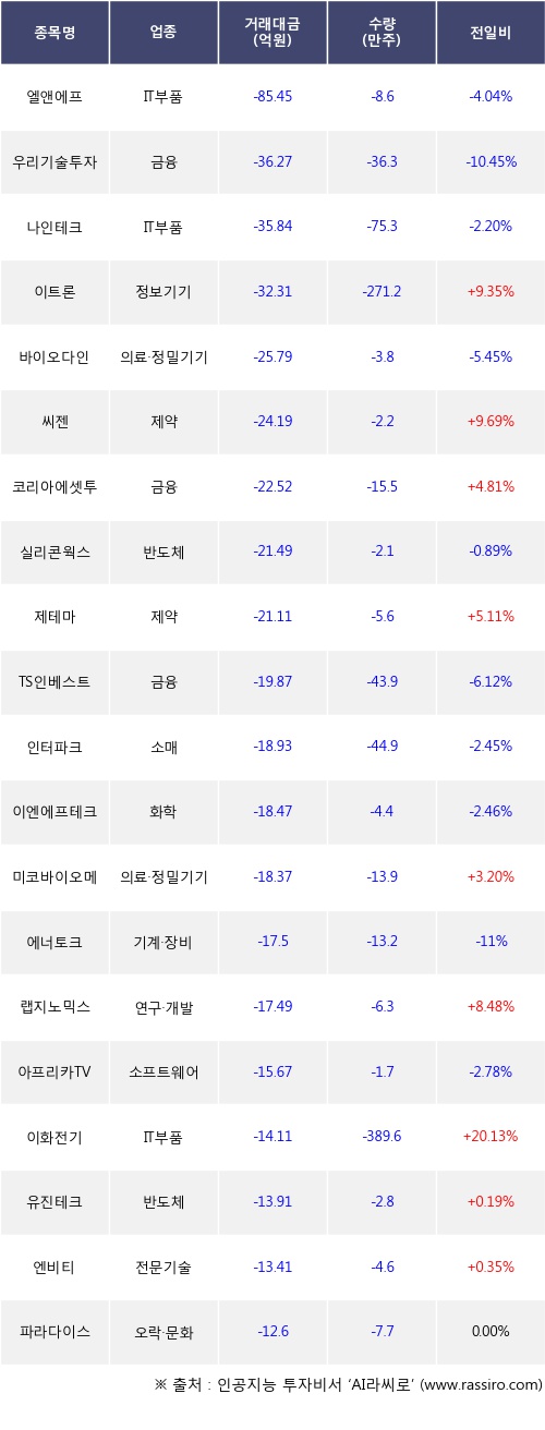기관 투자자의 순매도 상위 20개 종목은 엘앤에프, 우리기술투자, 나인테크, 이트론, 바이오다인, 씨젠, 코리아에셋투자증권, 실리콘웍스, 제테마, TS인베스트먼트등이다.