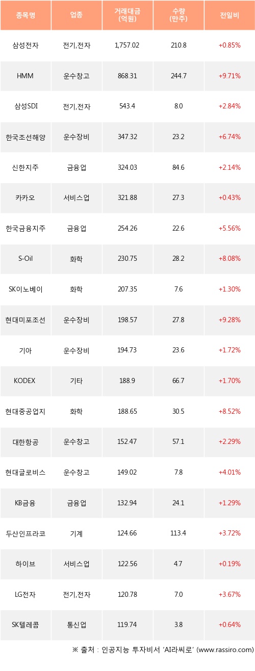 외국인 투자자의 순매수 상위 20개 종목은 삼성전자, HMM, 삼성SDI, 한국조선해양, 신한지주, 카카오, 한국금융지주, S-Oil, SK이노베이션, 현대미포조선등이다.