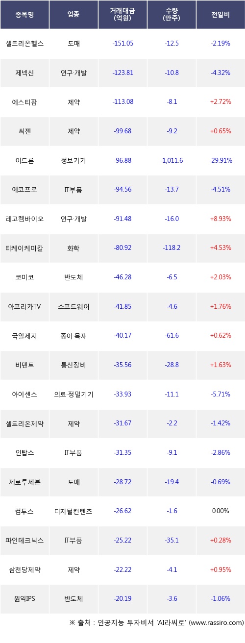 외국인 투자자의 순매도 상위 20개 종목은 셀트리온헬스케어, 제넥신, 에스티팜, 씨젠, 이트론, 에코프로, 레고켐바이오, 티케이케미칼, 코미코, 아프리카TV등이다.