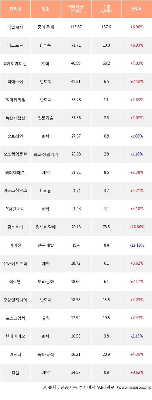 외국인 투자자의 순매수 상위 20개 종목은 국일제지, 에코프로, 티케이케미칼, 티에스이, SK머티리얼즈, 녹십자랩셀, 솔브레인, 오스템임플란트, 바디텍메드, 이녹스첨단소재등이다.