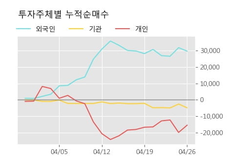 지난 한달을 기준으로 보면 외국인이 3.1만주를 순매수한 반면, 기관은 4,831주를 순매도했고, 개인들도 1.6만주를 순매도한 것으로 집계됐다. 같은 기간, 개인의 거래 비중이 86.8%로 가장 높아, 이 종목의 주요 거래 주체는 개인이었음을 알 수 있다.
