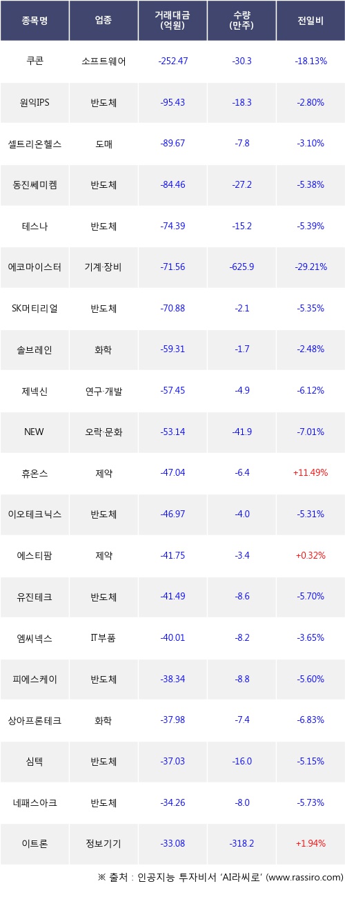 기관 투자자의 순매도 상위 20개 종목은 쿠콘, 원익IPS, 셀트리온헬스케어, 동진쎄미켐, 테스나, 에코마이스터, SK머티리얼즈, 솔브레인, 제넥신, NEW등이다.