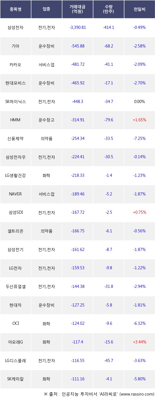 외국인 투자자의 순매도 상위 20개 종목은 삼성전자, 기아, 카카오, 현대모비스, SK하이닉스, HMM, 신풍제약, 삼성전자우, LG생활건강, NAVER등이다.