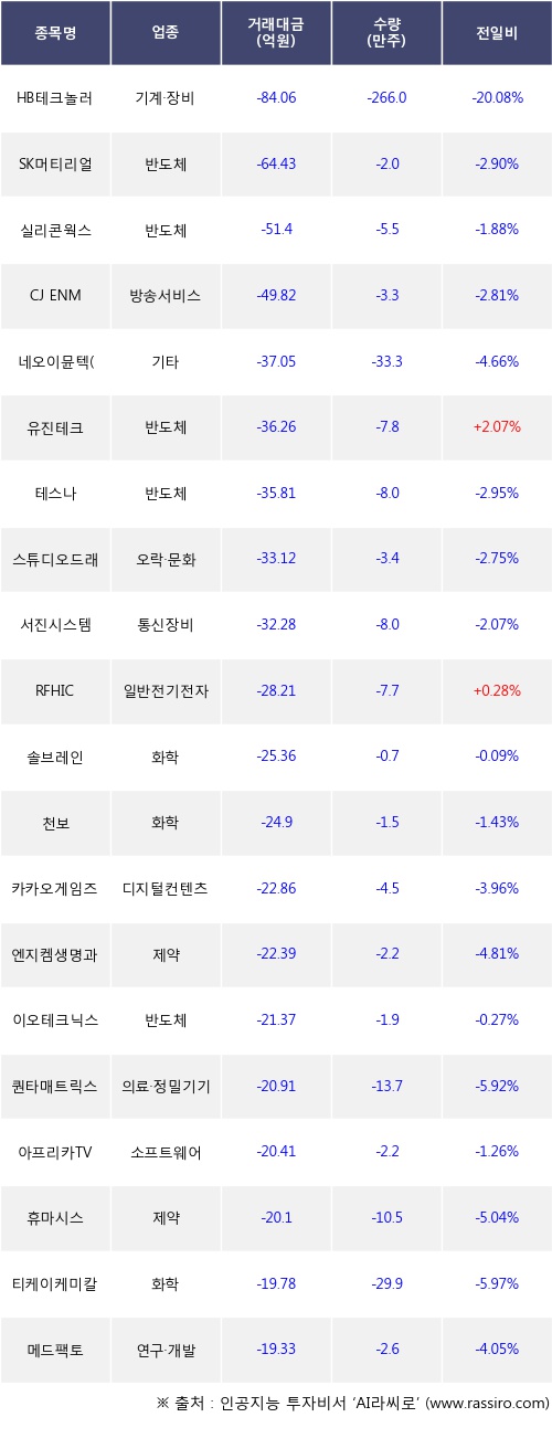 기관 투자자의 순매도 상위 20개 종목은 HB테크놀러지, SK머티리얼즈, 실리콘웍스, CJ ENM, 네오이뮨텍(Reg.S), 유진테크, 테스나, 스튜디오드래곤, 서진시스템, RFHIC등이다.