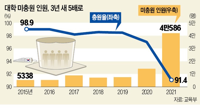 올해는 신입생을 100% 모집하지 못하는 대학이 속출했다. 전국 대학 충원율은 91.4%로, 신입생 4만586명이 미충원됐다. 미충원 인원의 75%인 3만458명이 비수도권에서 나왔다. 강원, 경남, 경북, 전남, 전북, 제주의 대학 신입생 평균 충원율은 아예 90% 밑으로 떨어졌다. 학령인구 감소가 계속 이어지는 만큼 구조조정이 불가피하다는 게 교육계의 분석이다.