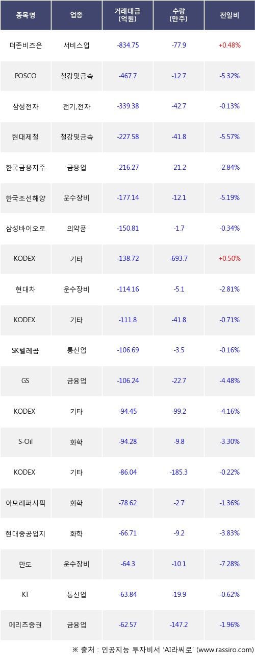 기관 투자자의 순매도 상위 20개 종목은 더존비즈온, POSCO, 삼성전자, 현대제철, 한국금융지주, 한국조선해양, 삼성바이오로직스, KODEX 200선물인버스2X, 현대차, KODEX 레버리지등이다.
