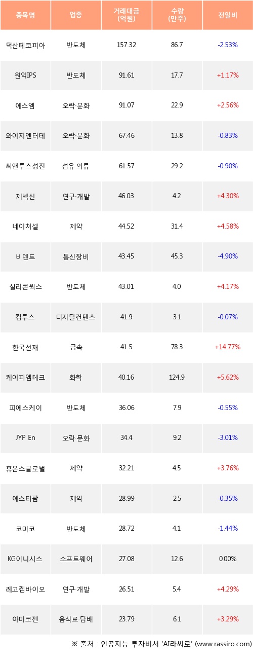 외국인 투자자의 순매수 상위 20개 종목은 덕산테코피아, 원익IPS, 에스엠, 와이지엔터테인먼트, 씨앤투스성진, 제넥신, 네이처셀, 비덴트, 실리콘웍스, 컴투스등이다.