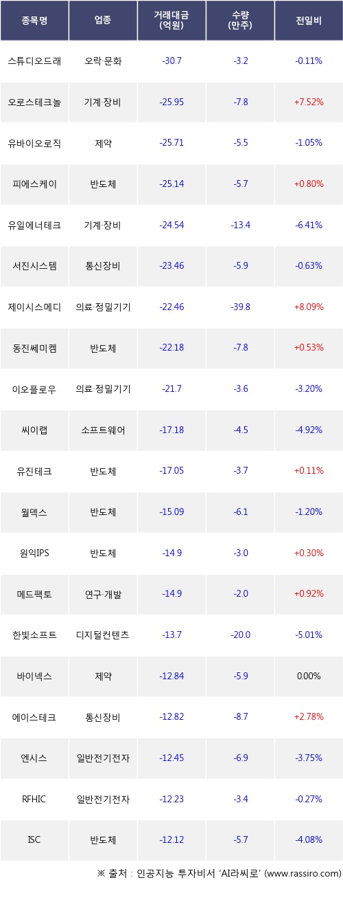기관 투자자의 순매도 상위 20개 종목은 스튜디오드래곤, 오로스테크놀로지, 유바이오로직스, 피에스케이, 유일에너테크, 서진시스템, 제이시스메디칼, 동진쎄미켐, 이오플로우, 씨이랩등이다.