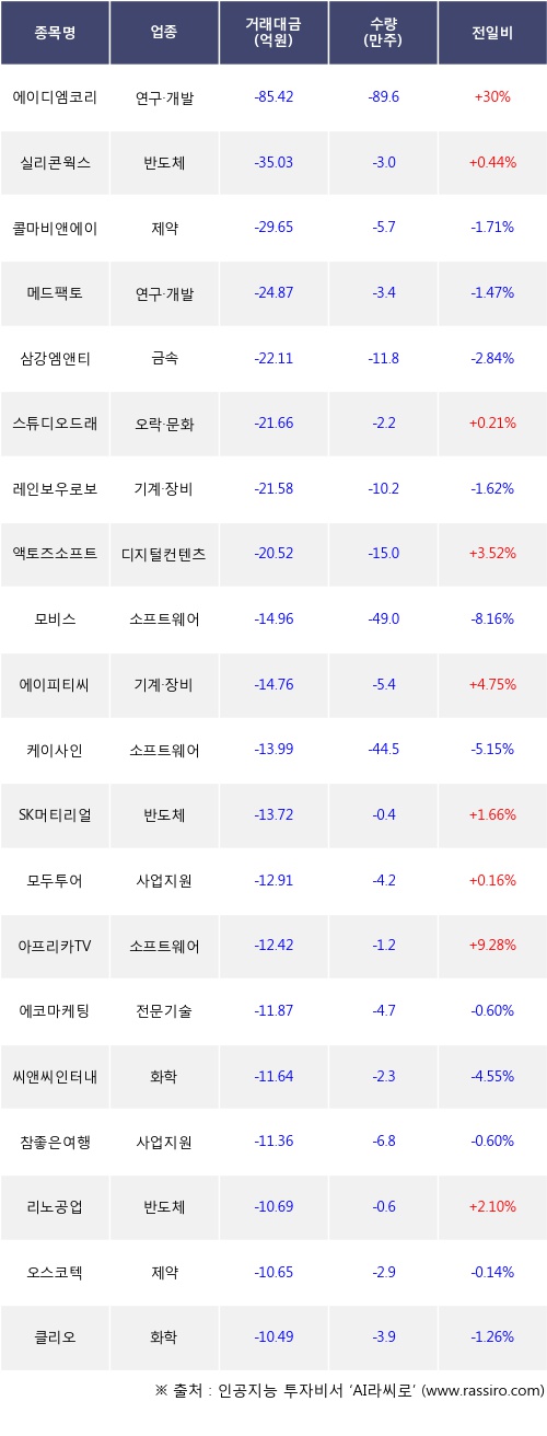 기관 투자자의 순매도 상위 20개 종목은 에이디엠코리아, 실리콘웍스, 콜마비앤에이치, 메드팩토, 삼강엠앤티, 스튜디오드래곤, 레인보우로보틱스, 액토즈소프트, 모비스, 에이피티씨등이다.