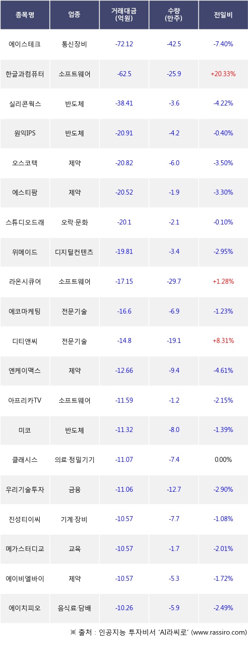 이날 기관 투자자가 순매도한 종목들 중에 한글과컴퓨터, 라온시큐어, 디티앤씨 등은 전일 대비 주가가 상승했고, 에이스테크, 실리콘웍스, 원익IPS 등은 주가가 하락했다.