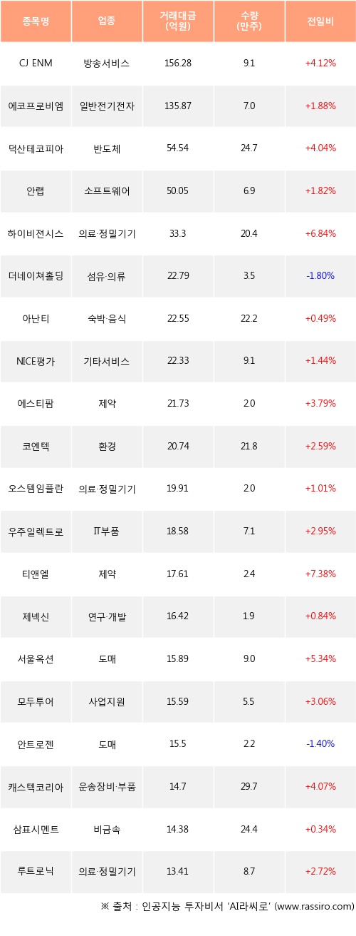 외국인 투자자의 순매수 상위 20개 종목은 CJ ENM, 에코프로비엠, 덕산테코피아, 안랩, 하이비젼시스템, 더네이쳐홀딩스, 아난티, NICE평가정보, 에스티팜, 코엔텍등이다.