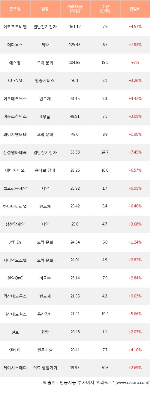 기관 투자자의 순매수 상위 20개 종목은 에코프로비엠, 메디톡스, 에스엠, CJ ENM, 이오테크닉스, 이녹스첨단소재, 와이지엔터테인먼트, 신성델타테크, 에이치피오, 셀트리온제약등이다.