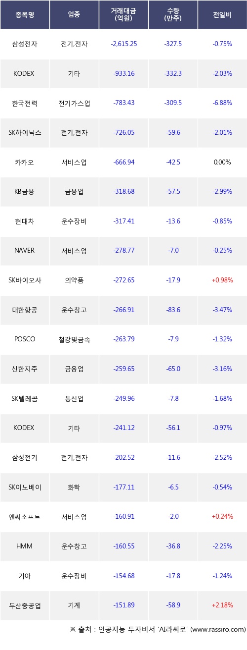 기관 투자자의 순매도 상위 20개 종목은 삼성전자, KODEX 레버리지, 한국전력, SK하이닉스, 카카오, KB금융, 현대차, NAVER, SK바이오사이언스, 대한항공등이다.