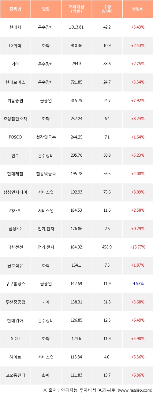 현대차, LG화학, 기아 등은 전일 대비 주가가 상승했고, 쿠쿠홀딩스 등은 주가가 하락했다.
