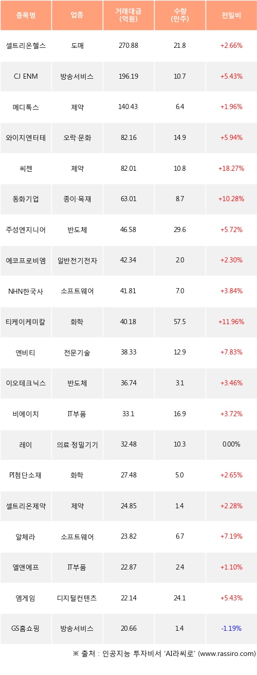 기관 투자자의 순매수 상위 20개 종목은 셀트리온헬스케어, CJ ENM, 메디톡스, 와이지엔터테인먼트, 씨젠, 동화기업, 주성엔지니어링, 에코프로비엠, NHN한국사이버결제, 티케이케미칼등이다.