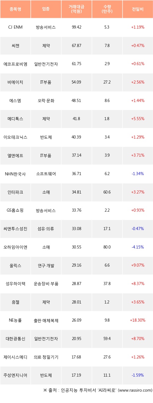 CJ ENM, 씨젠, 에코프로비엠 등은 전일 대비 주가가 상승했고, NHN한국사이버결제, 씨앤투스성진, 오하임아이엔티 등은 주가가 하락했다.