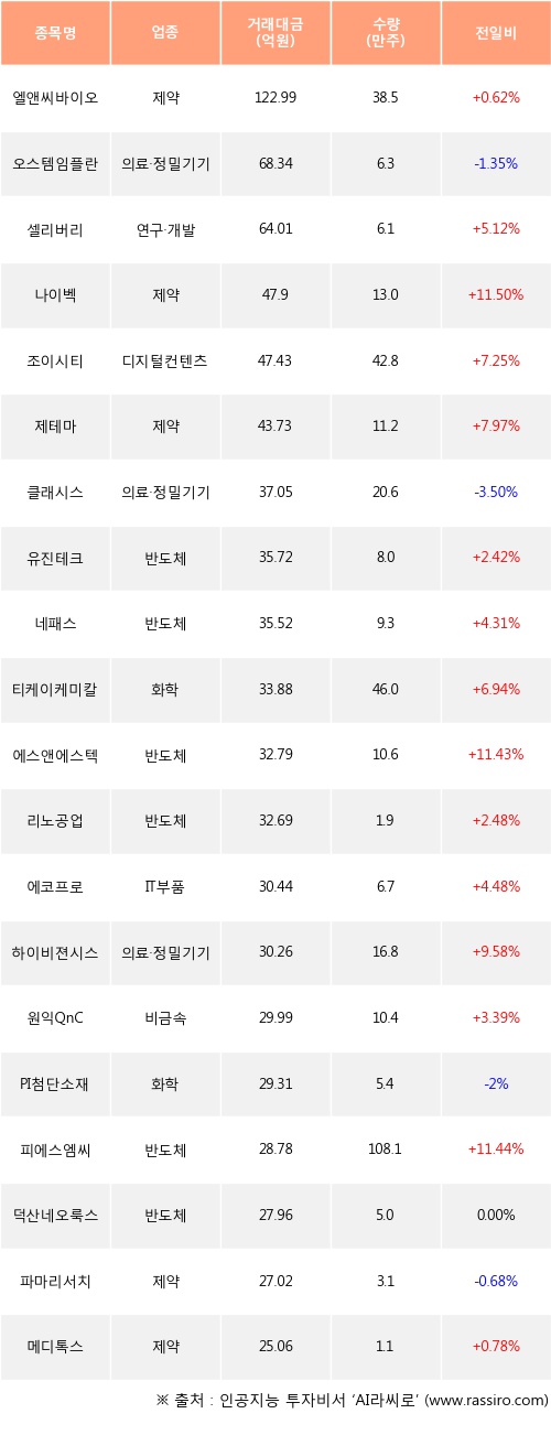 외국인 투자자의 순매수 상위 20개 종목은 엘앤씨바이오, 오스템임플란트, 셀리버리, 나이벡, 조이시티, 제테마, 클래시스, 유진테크, 네패스, 티케이케미칼등이다.