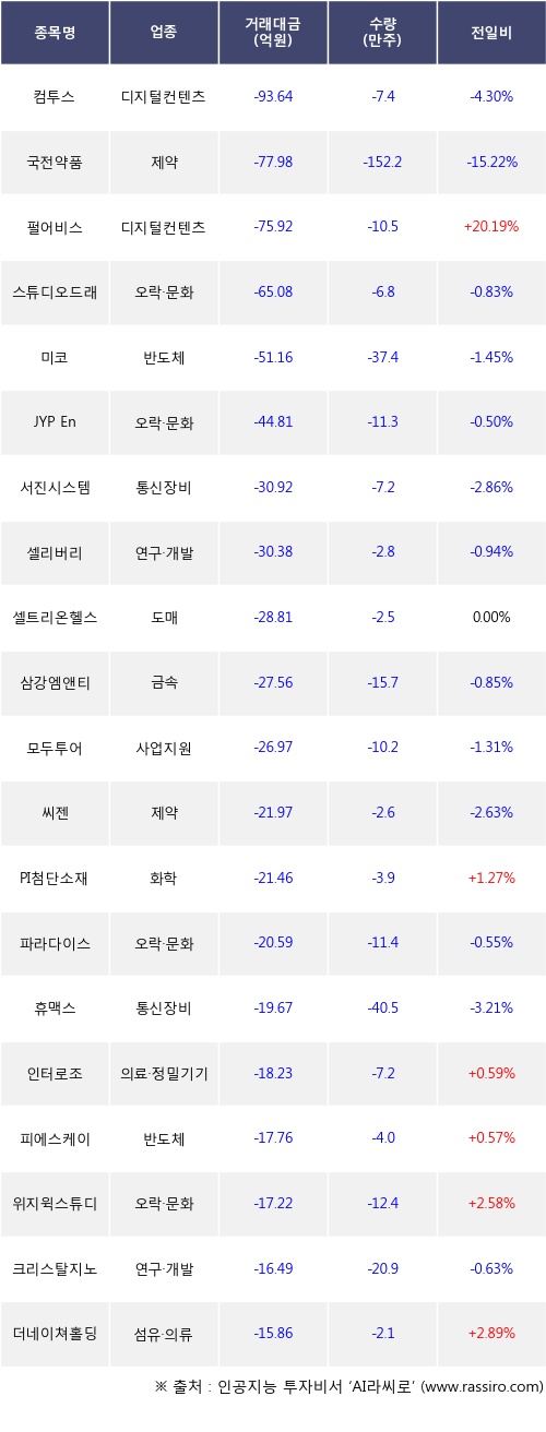 기관 투자자의 순매도 상위 20개 종목은 컴투스, 국전약품, 펄어비스, 스튜디오드래곤, 미코, JYP Ent., 서진시스템, 셀리버리, 셀트리온헬스케어, 삼강엠앤티등이다.