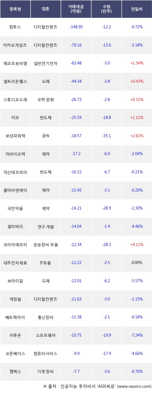 기관 투자자의 순매도 상위 20개 종목은 컴투스, 카카오게임즈, 에코프로비엠, 셀트리온헬스케어, 스튜디오드래곤, 미코, 보성파워텍, 차바이오텍, 덕산테코피아, 콜마비앤에이치등이다.