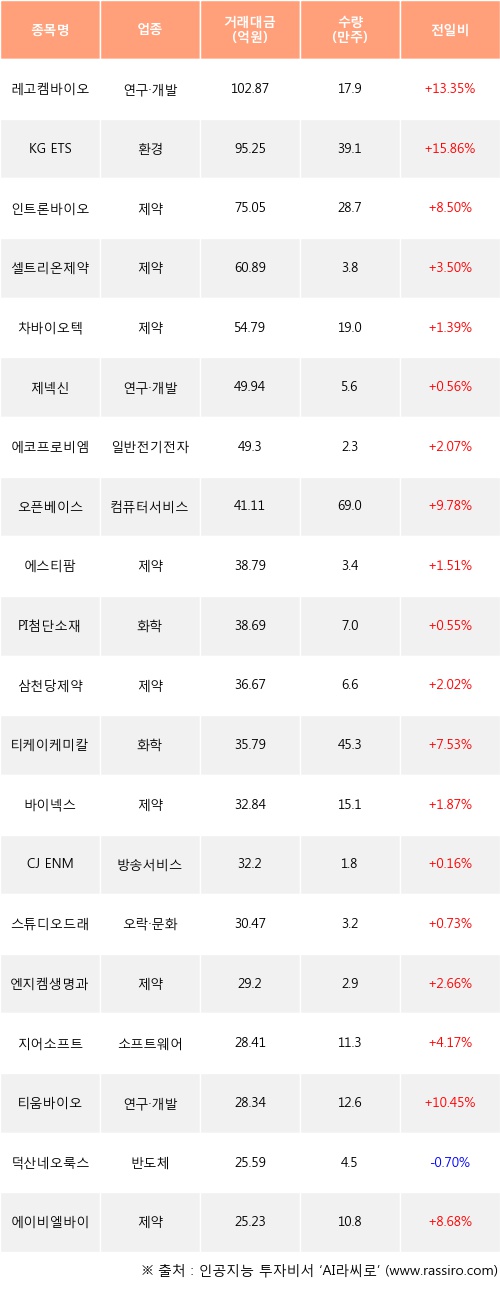 레고켐바이오, KG ETS, 인트론바이오 등은 전일 대비 주가가 상승했고, 덕산네오룩스 등은 주가가 하락했다.