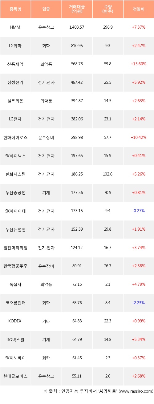 외국인 투자자의 순매수 상위 20개 종목은 HMM, LG화학, 신풍제약, 삼성전기, 셀트리온, LG전자, 한화에어로스페이스, SK하이닉스, 한화시스템, 두산중공업등이다.