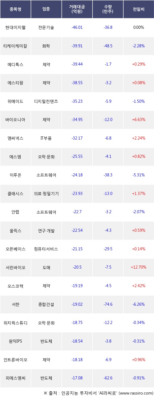 외국인 투자자의 순매도 상위 20개 종목은 현대이지웰, 티케이케미칼, 메디톡스, 에스티팜, 위메이드, 바이오니아, 엠씨넥스, 에스엠, 이루온, 클래시스등이다.