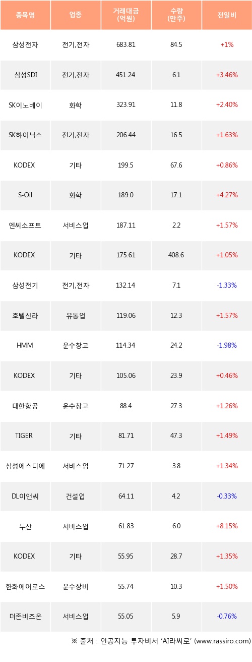 삼성전자, 삼성SDI, SK이노베이션 등은 전일 대비 주가가 상승했고, 삼성전기, HMM, DL이앤씨 등은 주가가 하락했다.