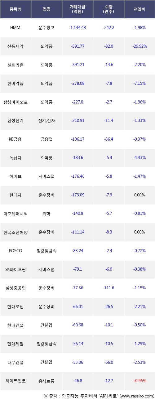 외국인 투자자의 순매도 상위 20개 종목은 HMM, 신풍제약, 셀트리온, 한미약품, 삼성바이오로직스, 삼성전기, KB금융, 녹십자, 하이브, 현대차등이다.