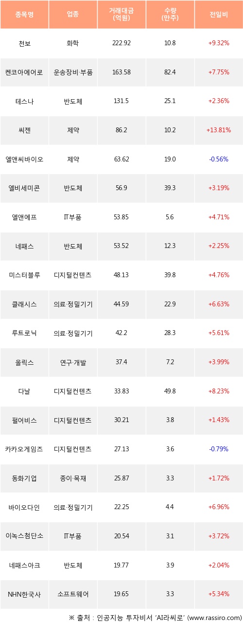 천보, 켄코아에어로스페이스, 테스나 등은 전일 대비 주가가 상승했고, 엘앤씨바이오, 카카오게임즈 등은 주가가 하락했다.