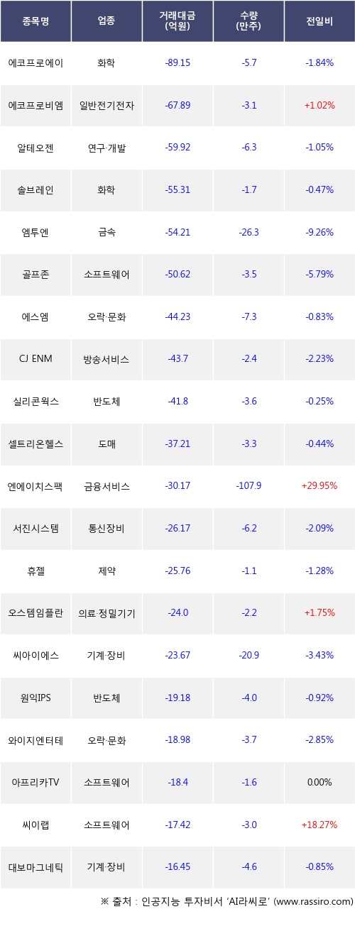 기관 투자자의 순매도 상위 20개 종목은 에코프로에이치엔, 에코프로비엠, 알테오젠, 솔브레인, 엠투엔, 골프존, 에스엠, CJ ENM, 실리콘웍스, 셀트리온헬스케어등이다.