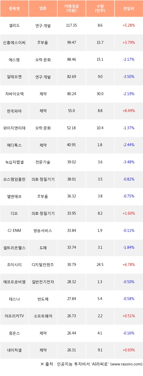 셀리드, 신흥에스이씨, 한국파마 등은 전일 대비 주가가 상승했고, 에스엠, 알테오젠, 차바이오텍 등은 주가가 하락했다.