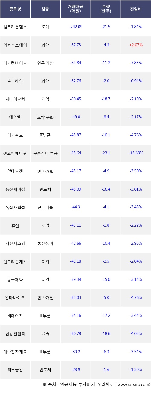 기관 투자자의 순매도 상위 20개 종목은 셀트리온헬스케어, 에코프로에이치엔, 레고켐바이오, 솔브레인, 차바이오텍, 에스엠, 에코프로, 켄코아에어로스페이스, 알테오젠, 동진쎄미켐등이다.