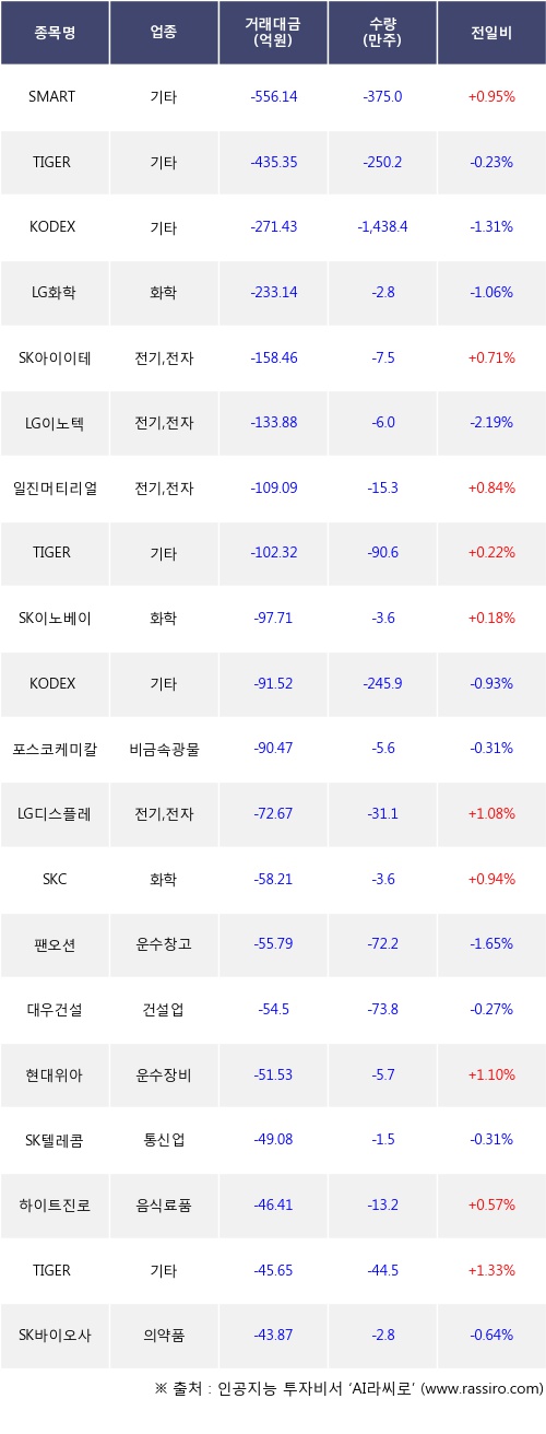 기관 투자자의 순매도 상위 20개 종목은 SMART 200TR, TIGER 차이나전기차SOLACTIVE, KODEX 200선물인버스2X, LG화학, SK아이이테크놀로지, LG이노텍, 일진머티리얼즈, TIGER 미국테크TOP10 INDXX, SK이노베이션, KODEX 인버스등이다.