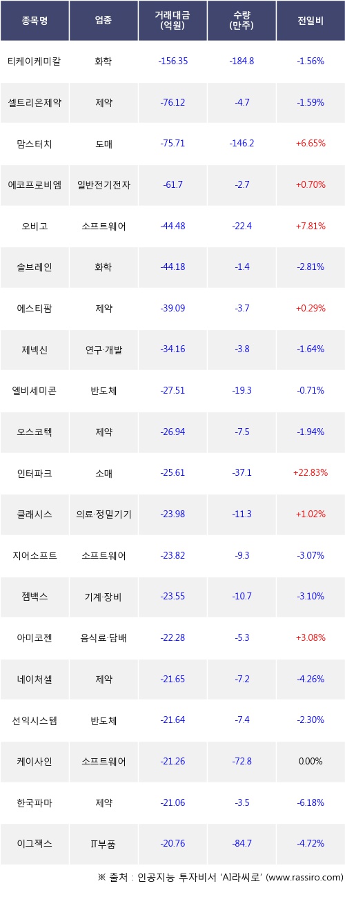 외국인 투자자의 순매도 상위 20개 종목은 티케이케미칼, 셀트리온제약, 맘스터치, 에코프로비엠, 오비고, 솔브레인, 에스티팜, 제넥신, 엘비세미콘, 오스코텍등이다.