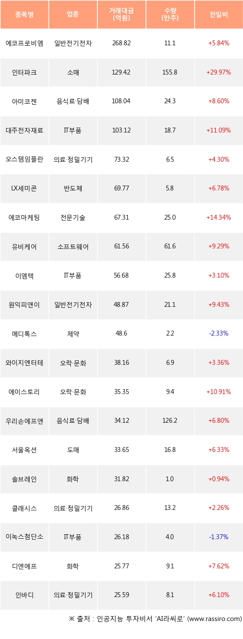에코프로비엠, 인터파크, 아미코젠 등은 전일 대비 주가가 상승했고, 메디톡스, 이녹스첨단소재 등은 주가가 하락했다.