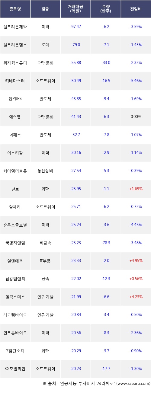 외국인 투자자의 순매도 상위 20개 종목은 셀트리온제약, 셀트리온헬스케어, 위지윅스튜디오, 키네마스터, 원익IPS, 에스엠, 네패스, 에스티팜, 케이엠더블유, 천보등이다.