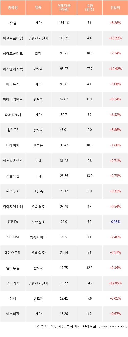 휴젤, 에코프로비엠, 상아프론테크 등은 전일 대비 주가가 상승했고, JYP Ent. 등은 주가가 하락했다.